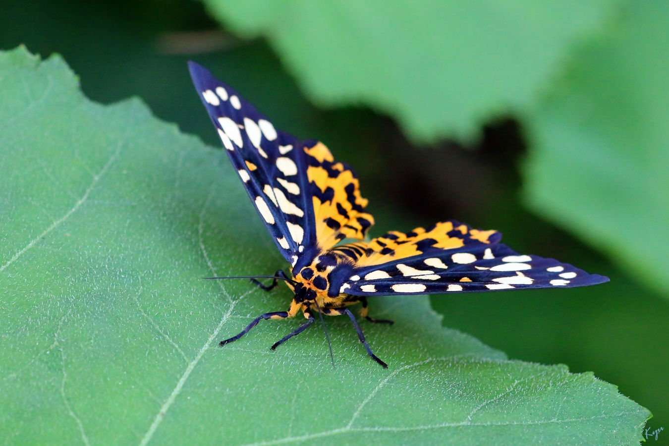 2016-05-13. 다음날 같은 사람인지는 모르지만 활발하게 날아 머위 잎 뒷면에 붙는다.
