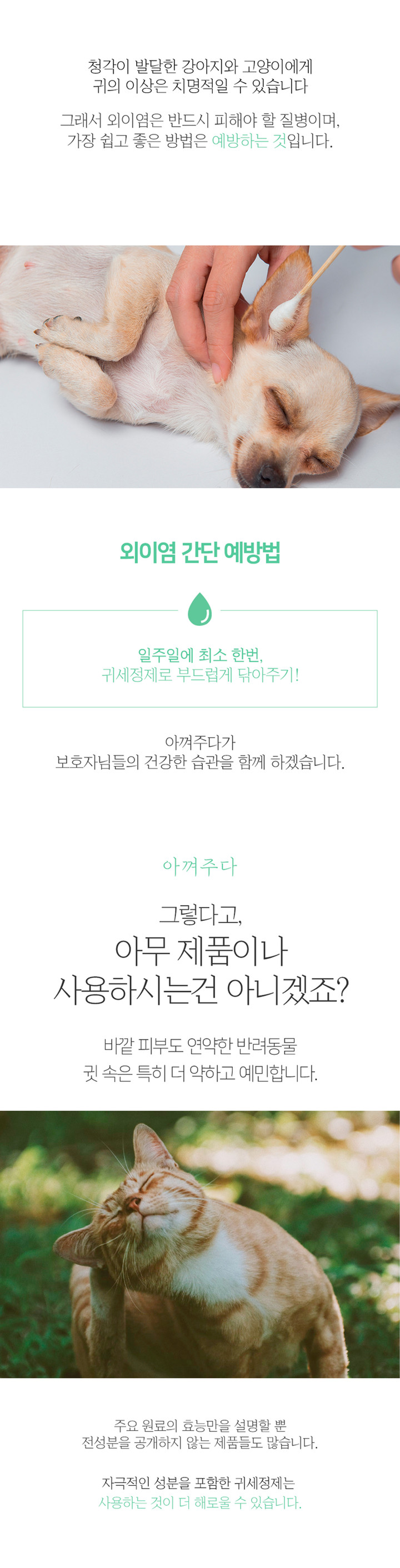 귀 청소는 어떻습니까? 전성분 EWG 그린등급 안심하고 안전하게 귀청소하세요! 후각이 발달한 반려동물에게 스트레스를 줄 수 있는 무향 무향료! 성분 공개!