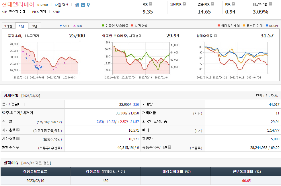 현대엘리베이터의 현재 주가는 전일 대비 -250원 하락한 25,900원이다. 현대엘리베이터의 주주현황을 살펴보면 현대네트웍스(외 20개사)가 26.57%의 지분을 보유하고 있다. 현대엘리베이는 엔지니어링 기업으로 장중 주가는 2만5900원이다. 삼성전자의 시가총액은 1조4280억원, 발행주식수는 29조9400억원이다. 외국인 참여율은 44,017%, 일중 거래량은 40,815,191건을 기록했다. 매출액은 1조5074억원, 영업이익은 1290억원이다. EPS는 없고 현대엘리베이터 주식의 배당수익률은 1.94%이다.