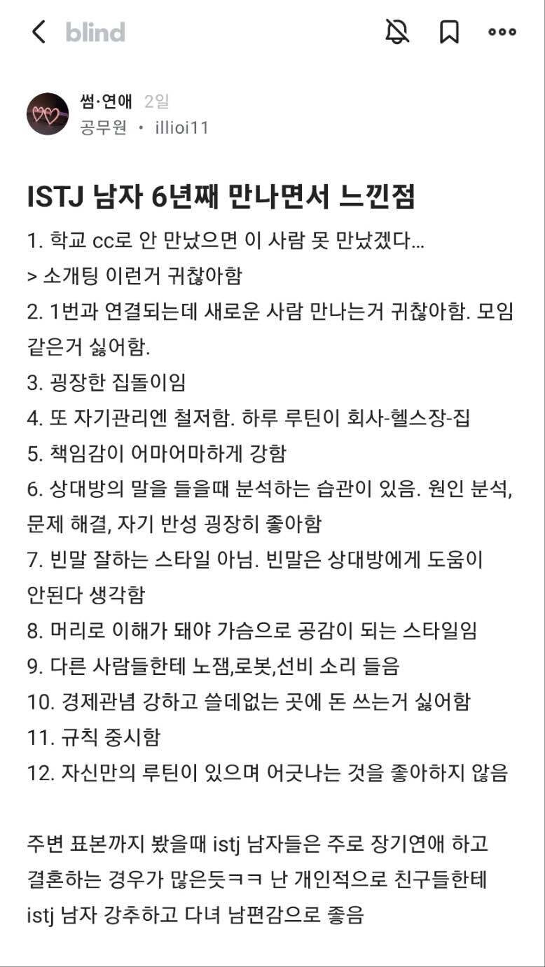 안녕하세요, 저는 싱글맘입니다. MBTI 유형 중 현실주의자이자 솔직하고 순진한 논리주의자인 ISTJ 남자에 대해 알아볼까 합니다. ISTJ 남자의 연애 특징, 소통 스타일, 플러팅에 대해 자세하게 설명드릴게요!